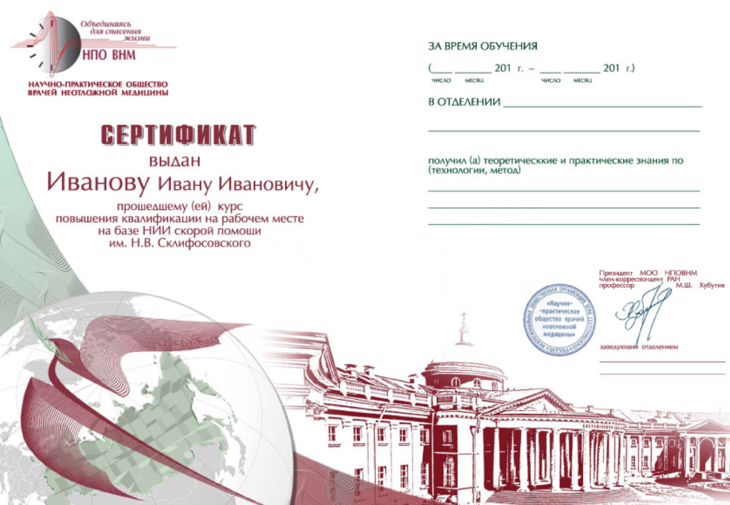 повышение профессиональной квалификации на базе НИИ СП им. Н.В. Склифосовского ( 5 рабочих дней) с получением сертификата НПО ВНМ